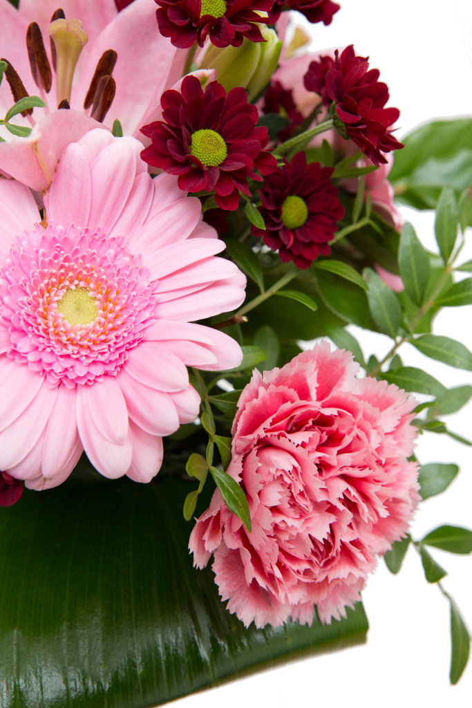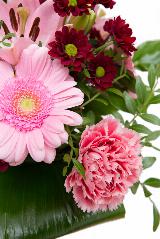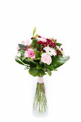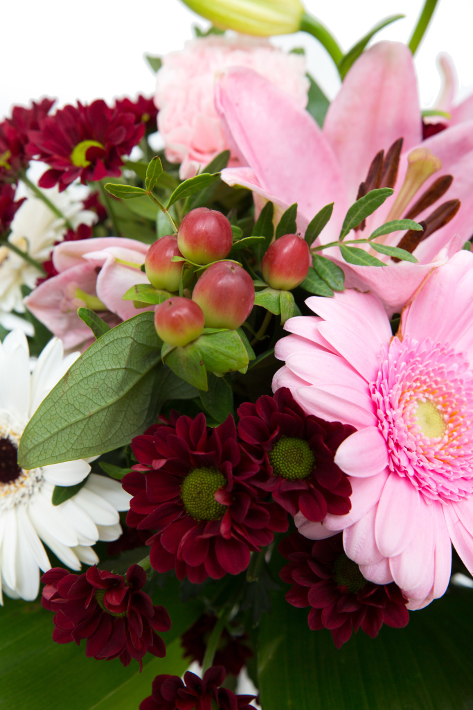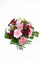 Zloženie: 4x Gerbera mini, 1x Ľalia, 3x Santinka, 2x Karafiát, 2x Hypericum + Dekoračná zeleň - ružovo-fialová kytica je krásnym darom pre zrelšie dámy, ktoré ocenia jej eleganciu.